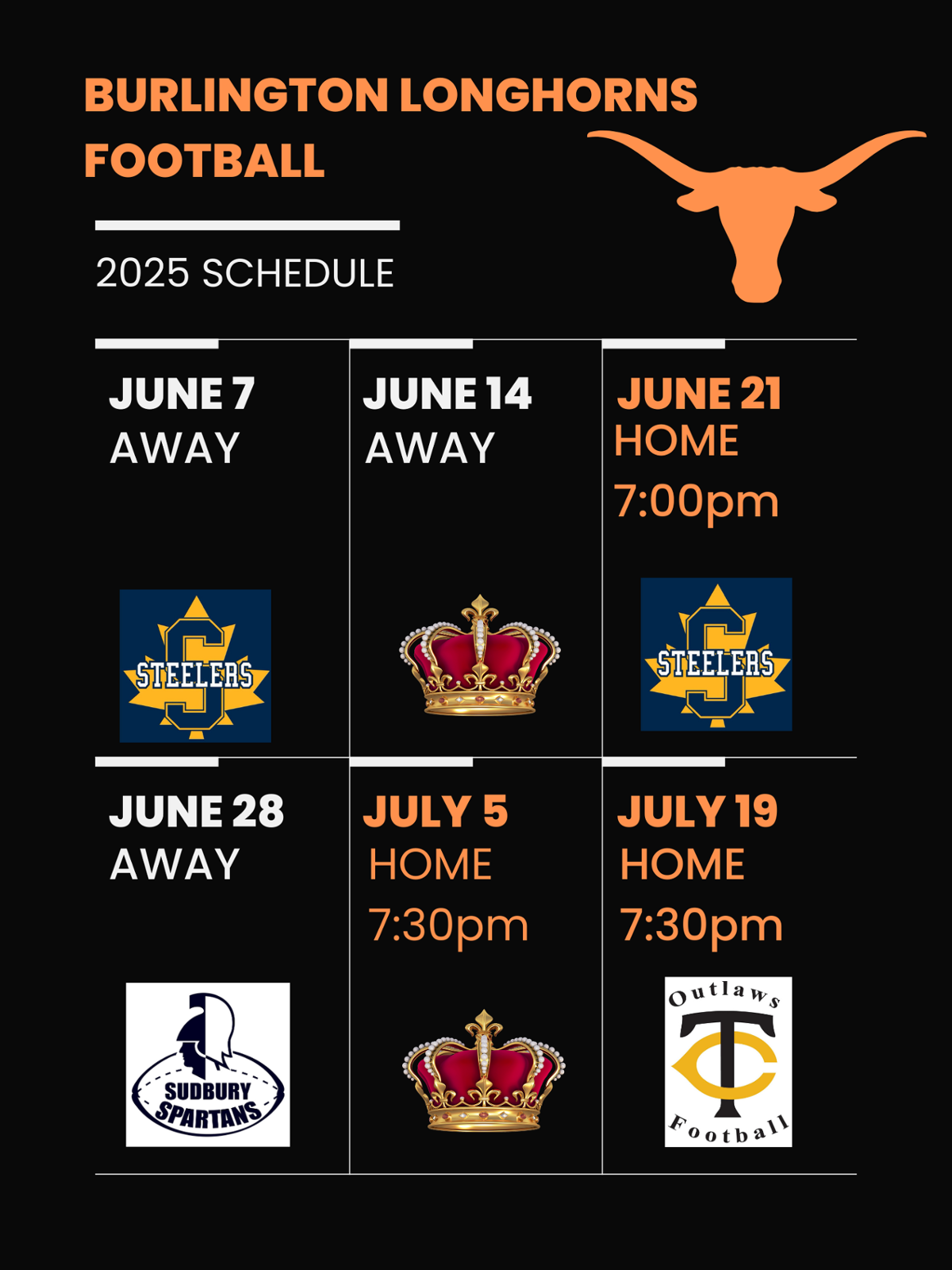 The Burlington Longhorns Football Club is an independent, privately operated organization. We are not affiliated with Corpus Christi Catholic Secondary School in Burlington, its athletic programs, or the Halton Catholic District School Board. While we may use the school's facilities outside of school hours, our programs, fees, and merchandise are not associated with or endorsed by the school or HCDSB.